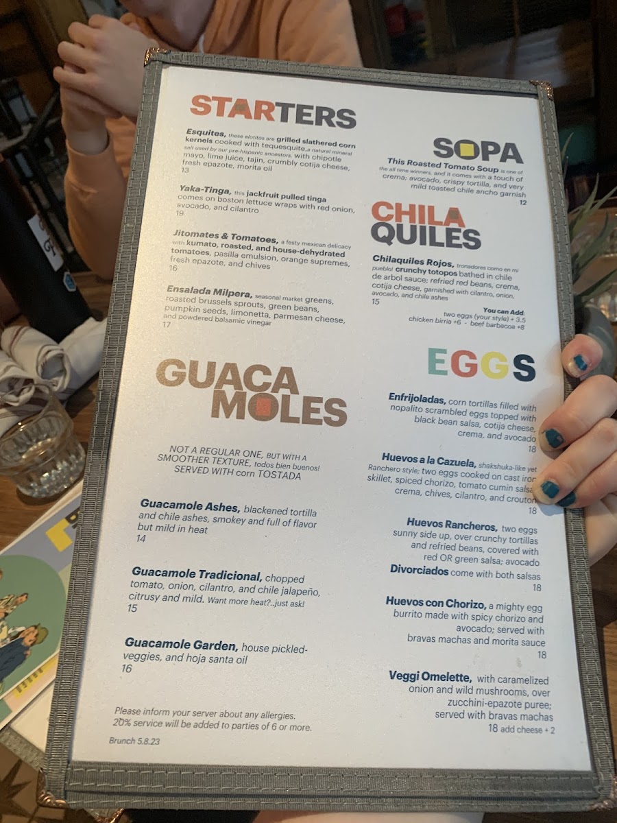 tronadores como en mi pueblo!crunchy totopos bathed in chile de arbol sauce; refried red beans, crema, cotija cheese, cilantro, onion, avocado, and chile ashes. you can add: two eggs (your style) + 3.5chicken birria +6 - beef barbacoa +8